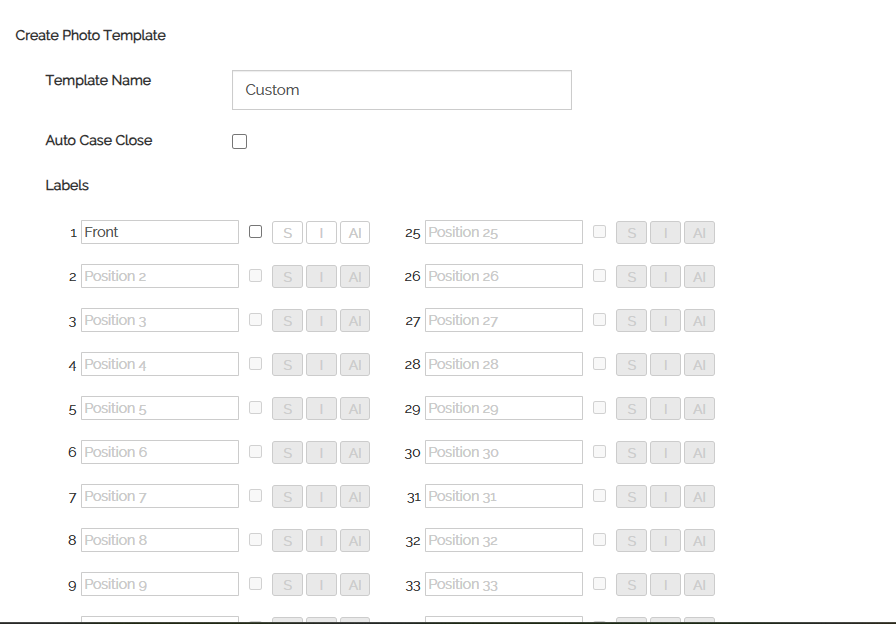 You will see the template creation screen. Start by entering a name for your template. You can also check the box for Auto Case Close if you want the case to close automatically once all required photos are completed.