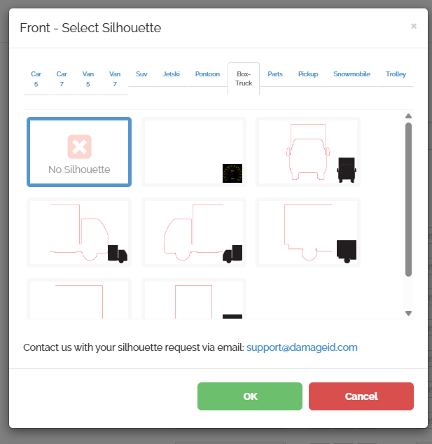 If you want to guide your drivers visually, click S next to a photo position. This opens a page where you can choose from many silhouettes, including cars, vans, SUVs, pickups, box trucks, and more. You can also choose no silhouette or contact DAMAGE iD if you need a custom one.
